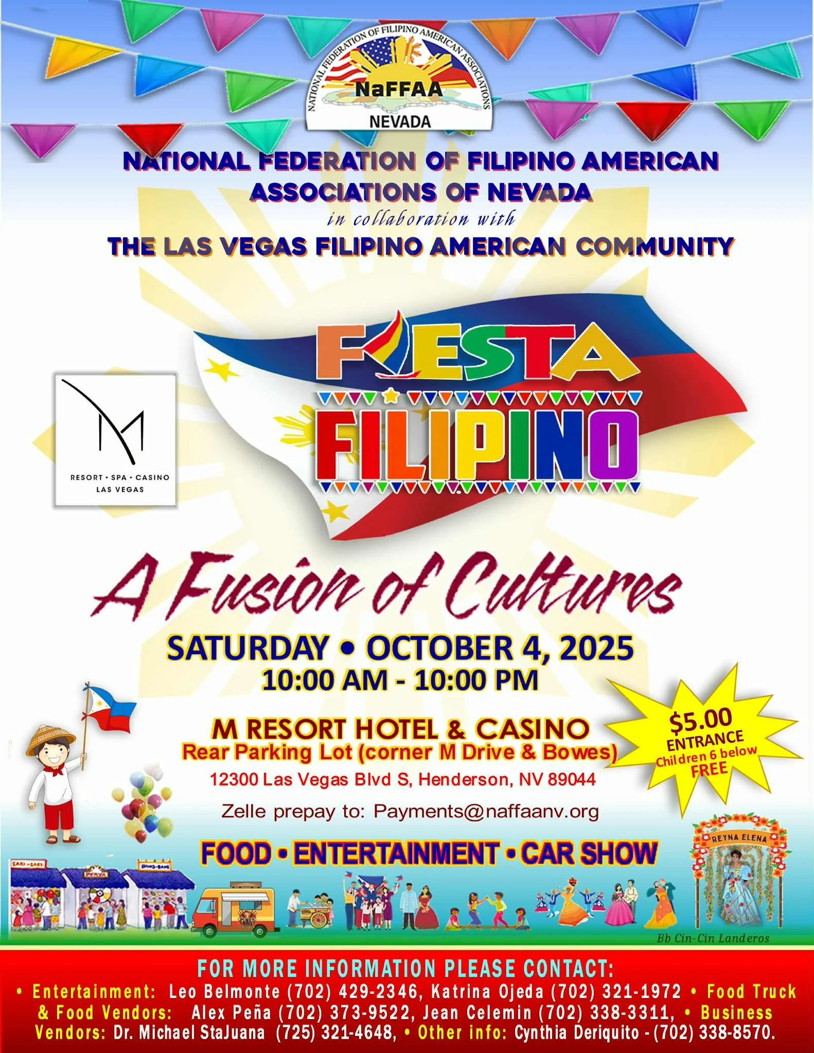 Join us for Fiesta Filipino 2025 at M Resort in Henderson, Nevada on October 4, 2025, presented by NaFFAA Nevada — a one-day cultural festival that brings together the best of Filipino food, live entertainment, traditional arts and crafts, and an exciting car show.